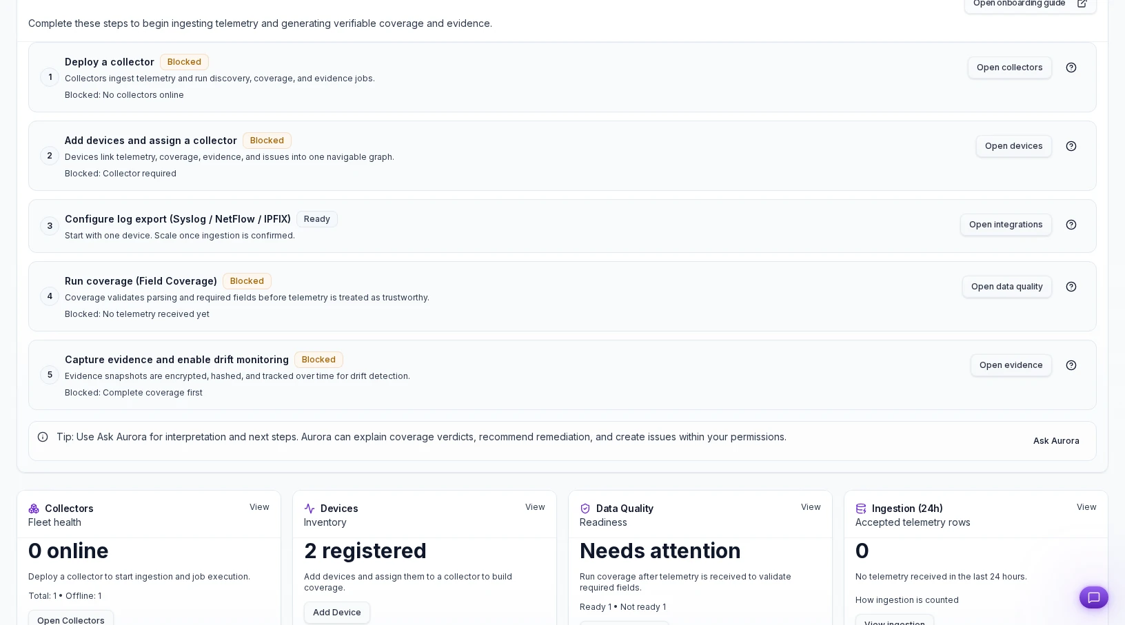 Command deploys scoped collectors inside regulated and hybrid environments, gates exports on coverage quality, and keeps deployment and support costs on a separate commercial path.